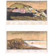 These two paintings are in the naí¯ve style of an estate cartographer. By George Wood, dated 1735 they portray a marvellously 'English' 18th century pastoral landscape with castle and a town with its seaside harbour. Dunster Castle, a castellated mansion, now National Trust, was originally built as a Norman stronghold around 1070 by William De Mohun, courtier of the Counqueror and Earl of Somerset, and then held by the Luttrells from 1376. The painting shows the house or 'castle', as no trace of the original Norman castle remained by the 18th century, before its 19th century alterations. In the centre of the faí§ade is the chapel designed by Sir James Thornhill in 1722 and then demolished in 1868. The battlemented skyline depicted in the painting has now the 19th century embellishment of the drawing room tower by the architect Anthony Salvin who remodelled the entire property between 1868 and 1872 on the instructions of George Fownes Luttrell. In the early 18th century a bowling green was laid out at the summit of the tor on the site of the keep an octagonal summerhouse was built and both can clearly be seen in this watercolour. These two paintings were executed during the life of Alexander Luttrel (1705-37) who died leaving considerable debts and an only daughter ages eleven. A receiver was appointed and the castle shut up. It is said that only the family plate was sold, but perhaps other things left the castle then too.