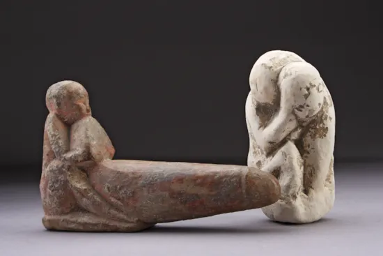 Figures of this type have been found at Pompeii and probably represent Priapus, a deity who was always phallic. An early fertility god, his particular responsibility was with gardens and farms. The phallus was not just an erotic device; it was also regarded as having a protective and apotropaic function.