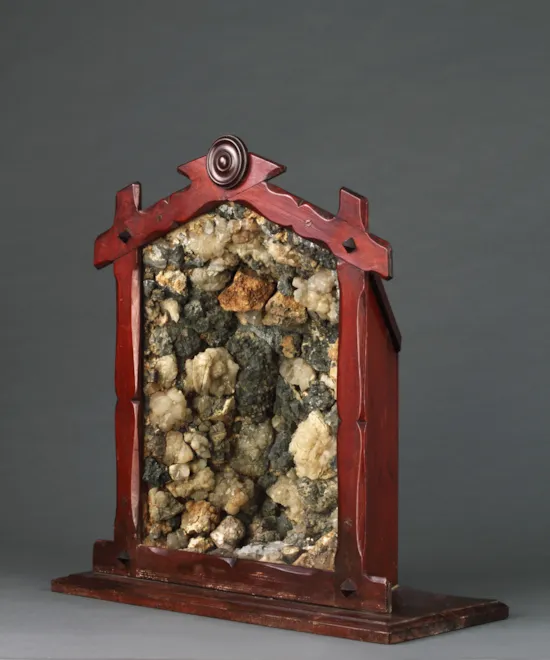 Unique to Cumbria spar boxes were a competitive traditional pastime of 19th century lead miners. Great pride was taken in the making of these cases from the mineral crystals they found in cavities as they worked the seams of lead ore. Annual shows and competitions were held in the towns of the North Penines and prizes were awarded for the best and most elaborate spar cases and models. Many of the prized exhibits were sold supplementing the miner’s income and becoming collector’s items of man made natural curiosity.