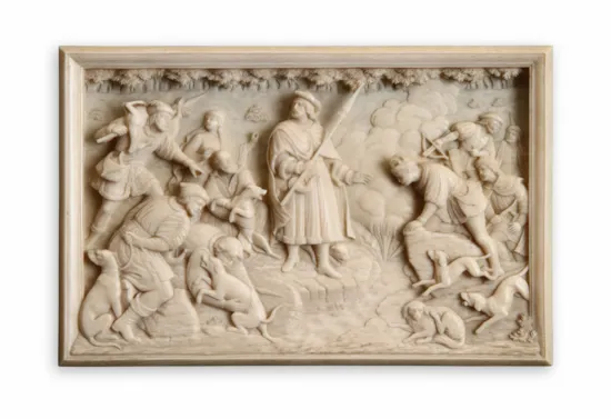A Fine French Dieppe Ivory Plaque Carved in High Relief With a Dramatic and Noble Stag Hunting Scene