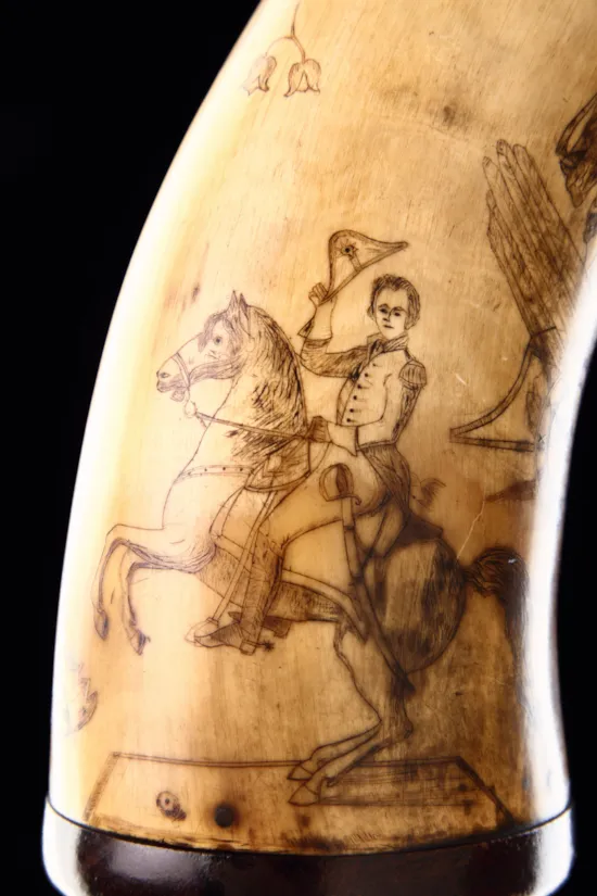 American Scrimshaw Powder Horn Etched with a Commemorative Scene of Andrew Jackson