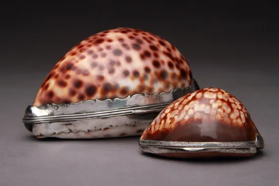 An Unusual Large South German Silver Mounted Tiger Cowry Shell ‘Cypraea Tigris’ Table Snuff Box together with a smaller Silver Mounted Tiger Cowry Shell Pocket Snuff Box, Probably Netherlandish
