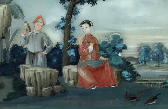 A Fine Chinese Export Reverse Glass Painting depicting a Chinese Courtier holding a Hawk and his Seated Lady Companion with a Pipe within an Oriental Garden