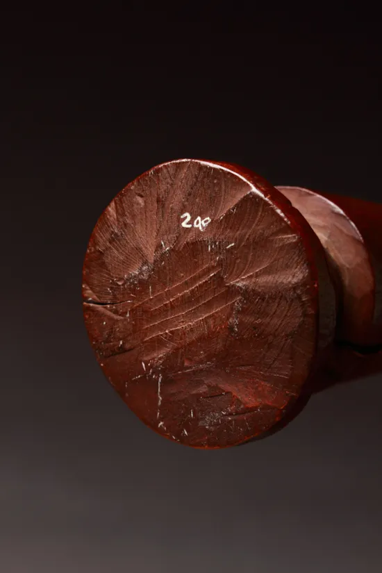 The Fanti are grouped in the coastal regions south of Asante territories and are Akan speakers who share Asante traditions and beliefs. ‘Akuaba’ dolls were carried by women on their backs to combat infertility and were dressed and cared for like real babies. After a successful birth they were placed by the household altar and sometimes were later given to daughters as educational toys in preparation for motherhood. ‘Akuaba’ were also worn by expectant mothers so that the baby would be beautiful. The extremely abstract body and the rigid, highly stylised features are said to symbolise the idea that the unborn foetus is not fully grown and so does not yet have a personality. The flat high forehead, joined up curved eyebrows and small breasts and mouth are all Fanti ideals of feminine beauty.