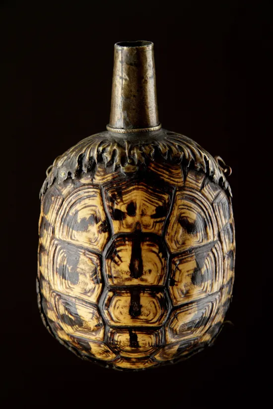 A South German Priming Flask made from the Carapace of a Herman’s Tortoise with Cast Brass Mounts in the Form of Acanthus Leaves
