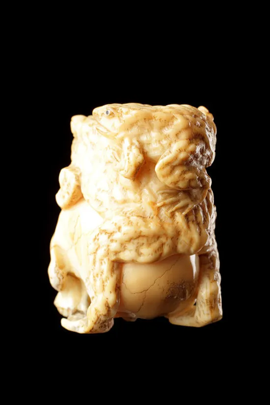 A Japanese Carved Ivory Okimono of a Human Skull Surmounted by Two Toads their eyes of inlaid horn ‘Memento Mori’