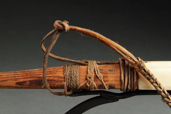 Hunting equipment, and especially bladder dart socket pieces, often display land or sea predators whose cunningness is engaged spiritually to enhance the hunter’s success. The socket piece on this example is engraved with a seal's head with open mouth, teeth and whiskers, ears, eyebrows and eyes set with Russian blue glass trade beads. The stylised ‘tooth pattern’ of the seal is often found on artefacts from the Norton Sound region where hunting magic and animal symbolism are important.