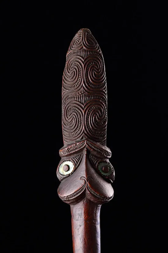 An Exceptional New Zealand Maori ‘Taiaha’ of early form the long flared blade terminating in a stylised projecting tongue shaped head decorated with scrolling ornament three eyes retaining haliotis shell inlay
