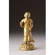 A Tibetan Cast and Gilded Copper Portrait Sculpture of a Buddhist Hierarch or Lohan Dressed in Flowing Robes with Short Cropped Hairstyle and Elongated Earlobes standing barefoot upon a Lotus Throne holding a Lotus Bud and Root