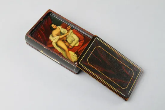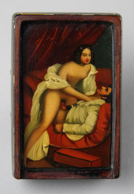 Unlike those of Ancient Rome, people in the 19th century regarded sex as shameful and any work of art, from antiquities to contemporary, deemed to be in the least erotically exciting was suppressed. Boxes such as this would have been hidden away and were often kept locked up in secret collections of erotica.