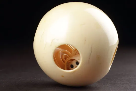 B. A Rare Turned Ivory Smooth Hollow Sphere with Four Apertures the Puzzle Ball Containing Two Loose Gaming Pieces and Two Moveable Dice Inside Two Turned Rhombic Dodecahedron