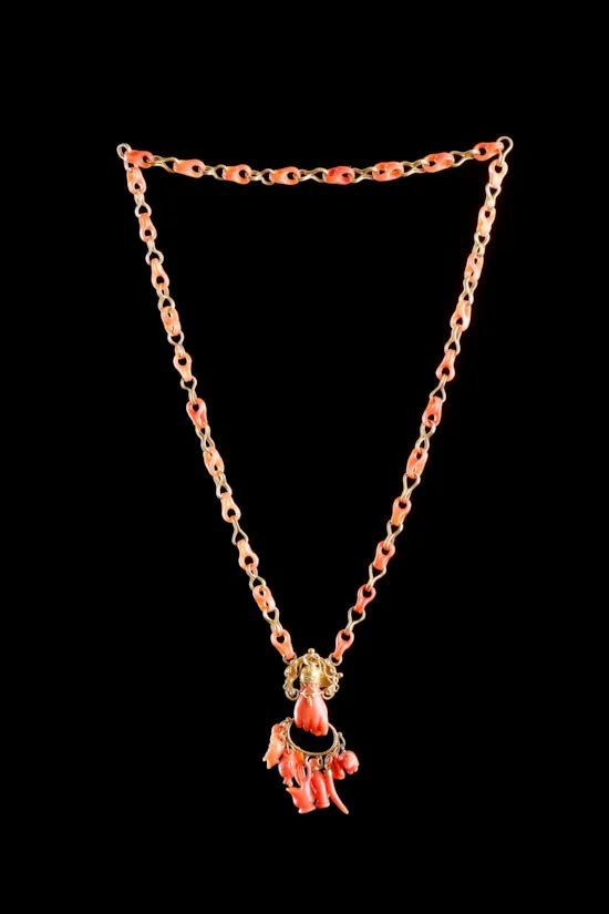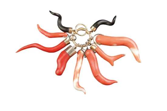 The potent gesture of the ‘figa’, the hand-shaped amulet with the first finger and characteristic position of the thumb forming the ‘mano cornuta’, was directed to ward off the evil eye. Made of coral these were believed to be highly efficacious affording the wearer special protection. Coral horns were an ancient phallic symbol of plenty, a powerful apotropaic deterrent to bad spirits and a force for good luck.