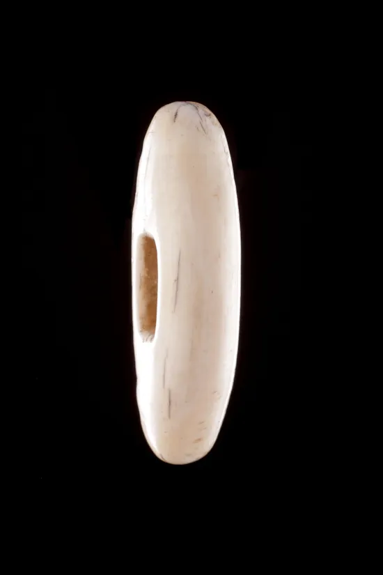 d. A Bering Sea Inuit Miniature Anthropomorphic Walrus Ivory Cord Attacher Depicting a Transformative Man with Large Nostrils and Tattoos used to Attach Lines and Tools to the Kayak