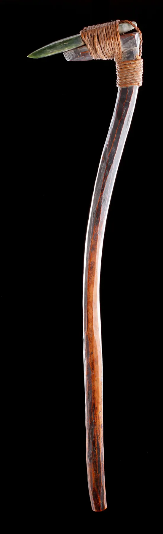 Before the introduction of metal, tools were limited but efficient. Nephrite ‘pounamu’ was highly prized, however ‘greywacke’ was more readily available and commonly used. The stone adze ‘toki’ was the principal tool used for felling and dressing timber, the blade secured to a strong, elbow-haft handle cut from a natural fork in the tree.