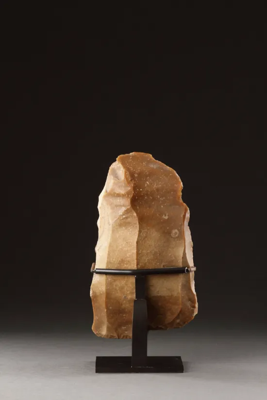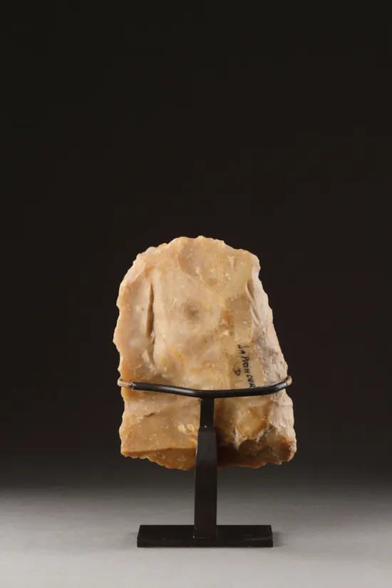 These flint blade cores are unmistakable for their rich ‘butter’ yellow colour hence the term ‘motte de beurre’. Large flint knives were struck from these cores known as ‘Livres du Beurre’ and can be up to 12 inches long. During the Neolithic period flint mines were dug at Le Grand – Pressigny in the southern Touraine and from here the flint cores were traded into Switzerland and beyond, being used as a form of currency.
