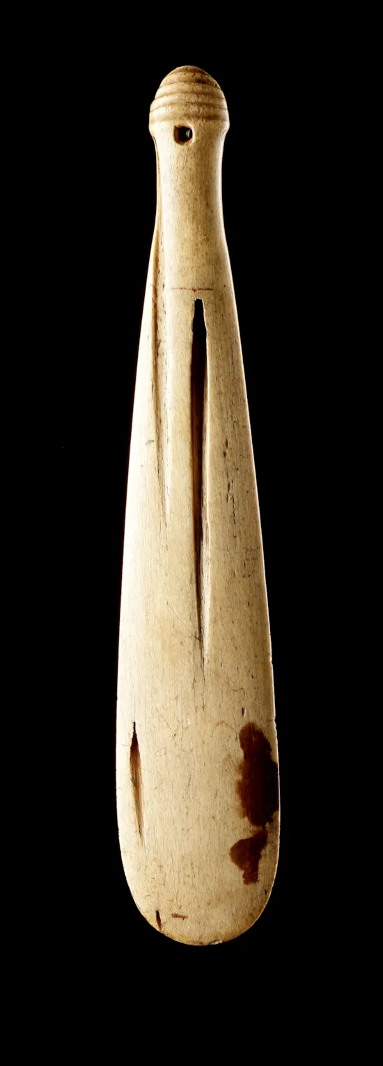 Made from the spatulate section of a whale’s jaw, the blade is known as the ‘rau’, which gave rise to the Maori term for conquest ‘raupatu’, presumably as so many successful battles were fought with this type of blade. Used as a striking weapon, the distal end of the club was thrust straight from the shoulder delivering a blow to the enemy’s temple, or if their hair could be grasped, the ‘patu’ could be driven up under the jaw or ribs.