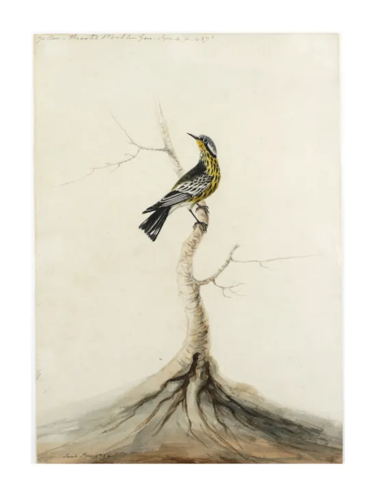 Although this is listed as a Yellow-throated Warbler, it is certainly not a typical example of the species. However, the careful way in which it is painted indicates that Sarah was observing the preserved bird in front of her with great accuracy.
