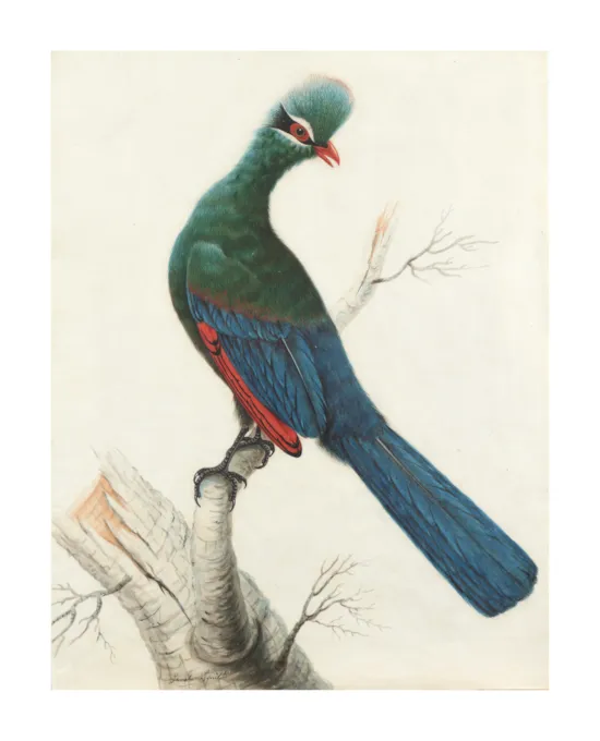 This watercolour of a Touraco from West Africa is almost identical to the watercolour following. Neither are dated and it is likely that both were produced at around the same time using the same mounted bird as a model.