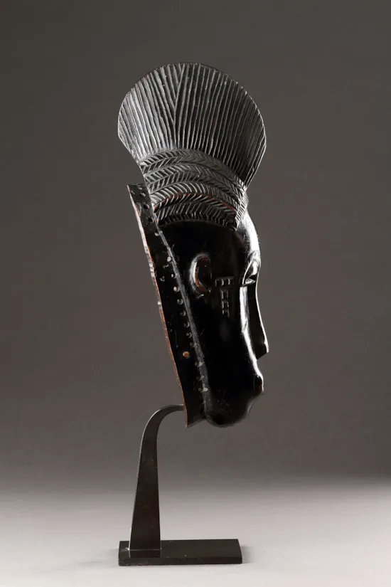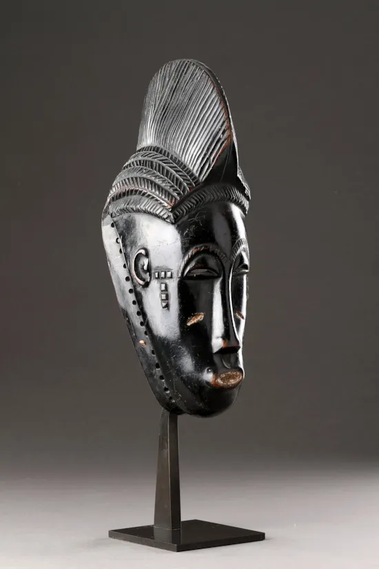 Baule sculpture is one of West Africa’s most significant art traditions. To western eyes, the essence of Baule style is a balanced asymmetry that excites while also suggesting stability and calm. Known for their stylisation, detail and remarkably refined features, these finely carved face masks are of a type that appears in village masquerades for recreational entertainment called ‘Mblo’. These dances and scripted performances are the cultural equivalent to western ‘opera’ or ‘film noire’. Everyone can see them and enjoy the communal event. Between performances the masks were kept out of sight carefully wrapped in bark cloth and hung from the thatch of their dancers’, sleeping rooms.